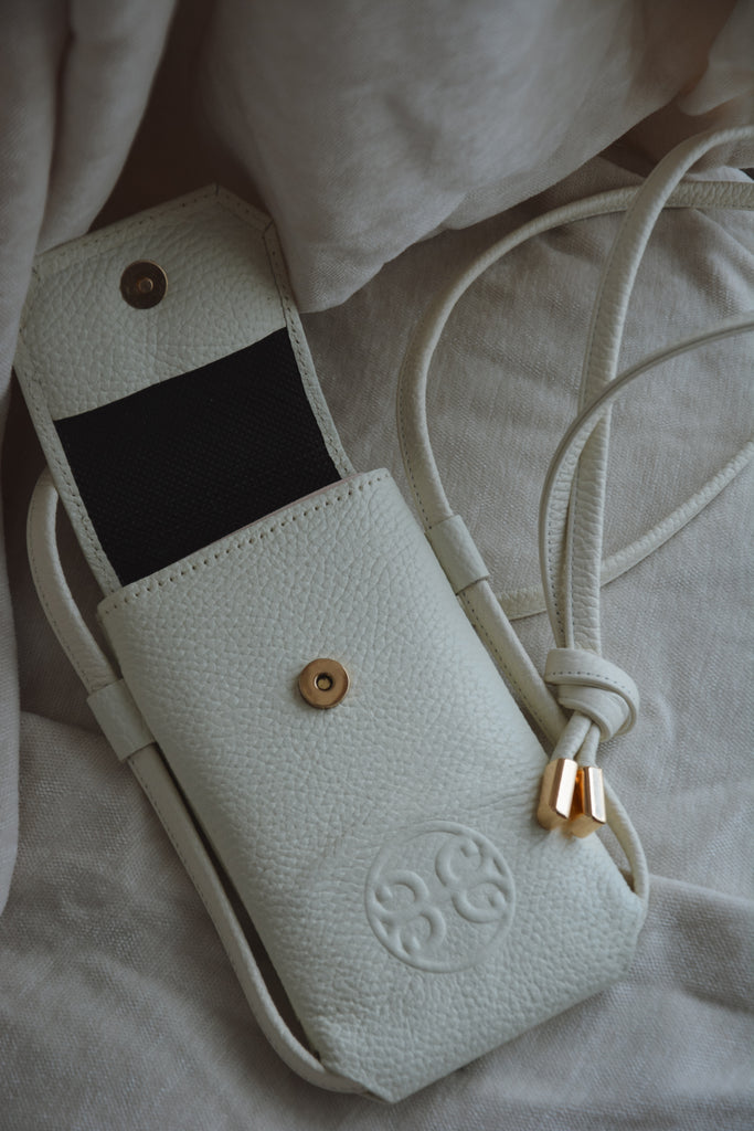 Un sac de téléphone en cuir élégant, raffiné avec une sangle nouée et des accents dorés. Une poche arrière discrète ajoute une fonction à sa forme élégante - une petite pièce à l'élégance intemporelle.