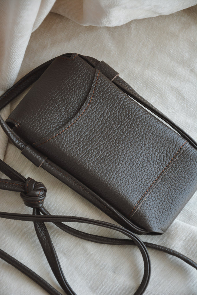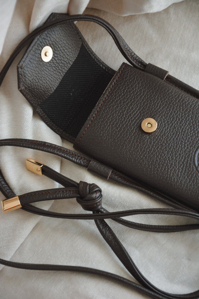 Un sac de téléphone en cuir élégant, raffiné avec une sangle nouée et des accents dorés. Une poche arrière discrète ajoute une fonction à sa forme élégante - une petite pièce à l'élégance intemporelle.
