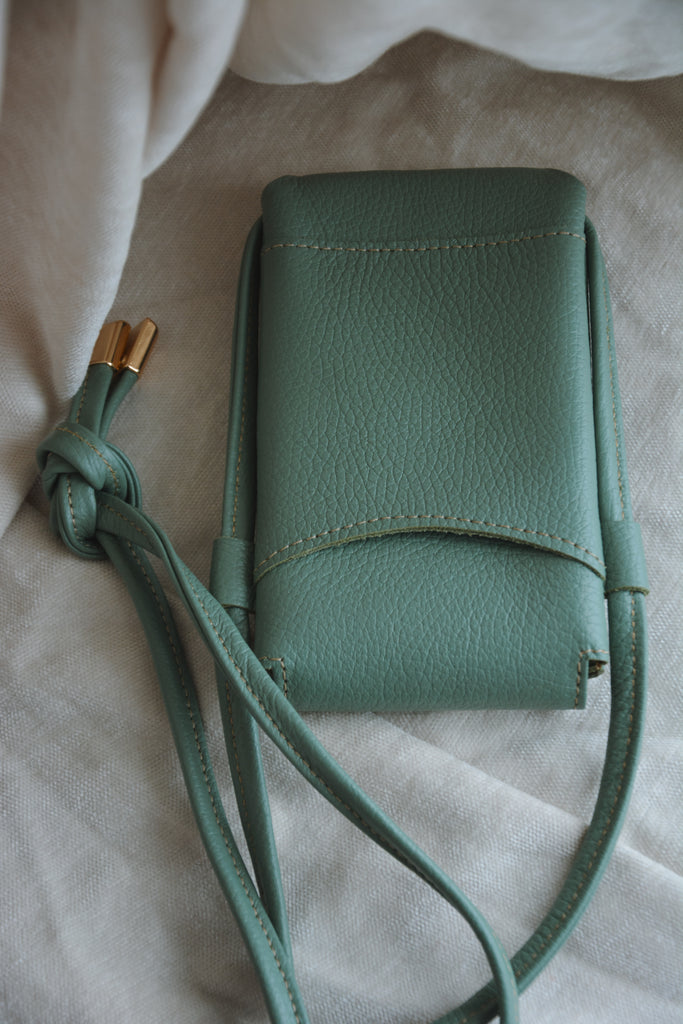 Un sac de téléphone en cuir élégant, raffiné avec une sangle nouée et des accents dorés. Une poche arrière discrète ajoute une fonction à sa forme élégante - une petite pièce à l'élégance intemporelle.