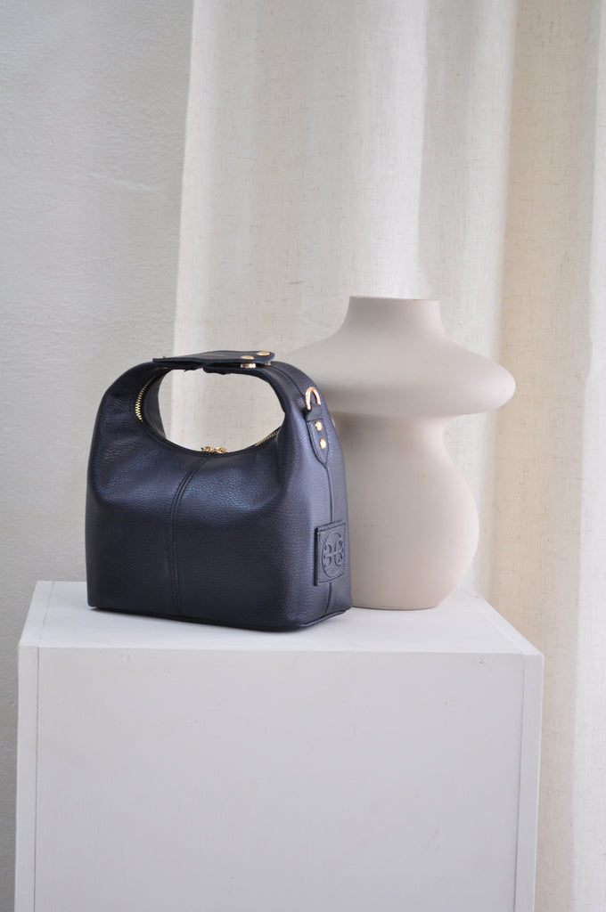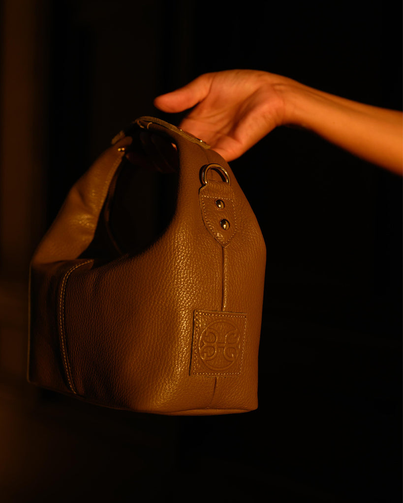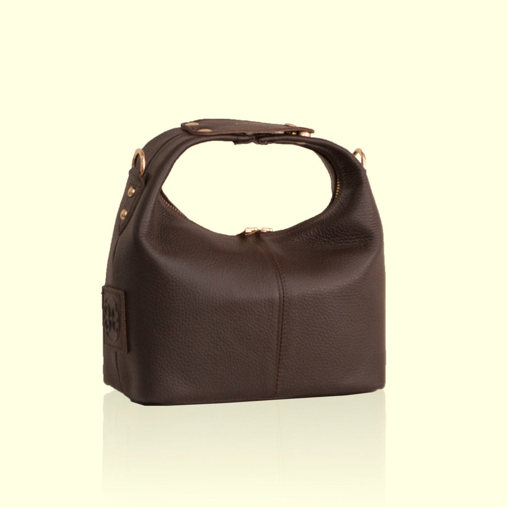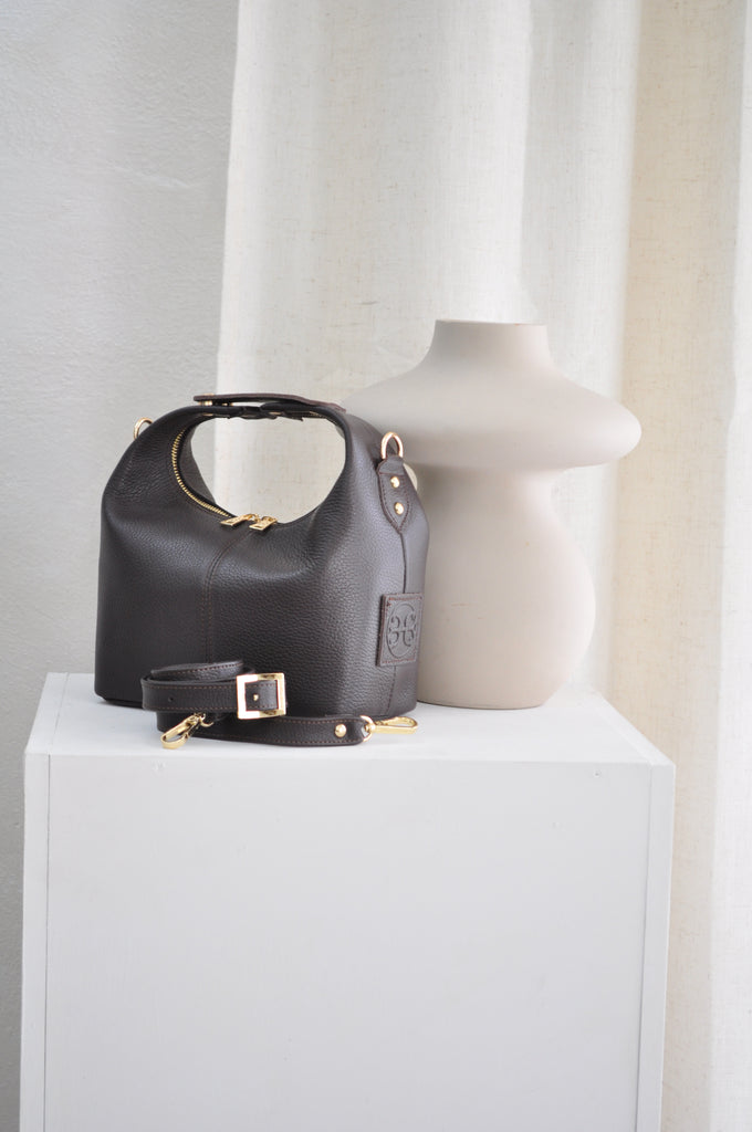 Il s'agit d'un sac à main en cuir au design architectural unique. Les deux anses sont prolongées et réunies en cercle sous le logo Bonendis embossé. Sur le côté de ce magnifique modèle est placée une sangle en cuir réglable, avec une élégante couture détaillée qui le transforme en un sac de corps à main libre.