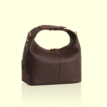 Is a leather handbag bag with a unique architectural design. The two handles are extended and joined together in a circle under the embossed BonendisLogo . On the side of this beautiful model is placed an adjustable leather strap, with elegant detailed stitching that alters it into a hand free body bag.
