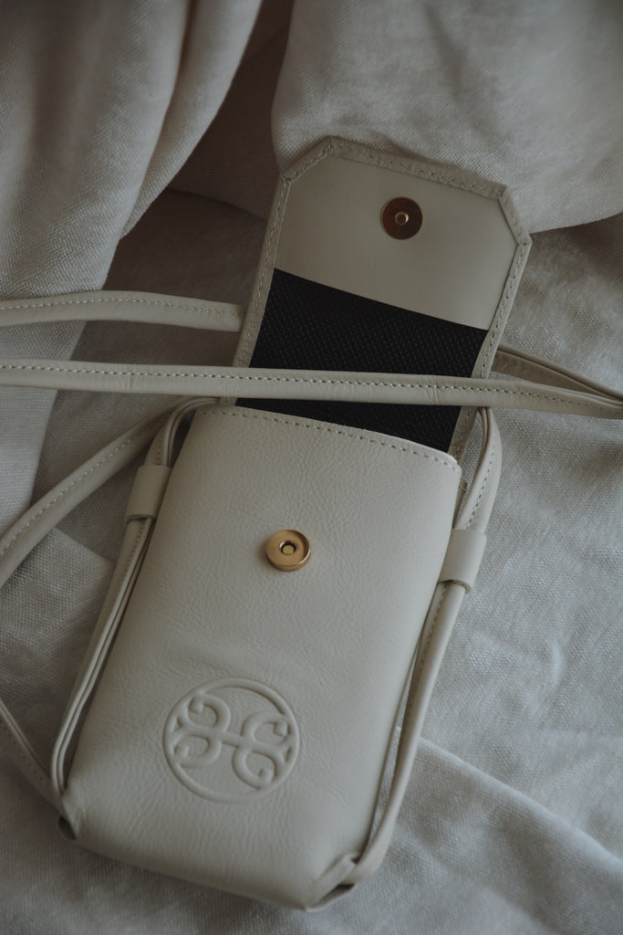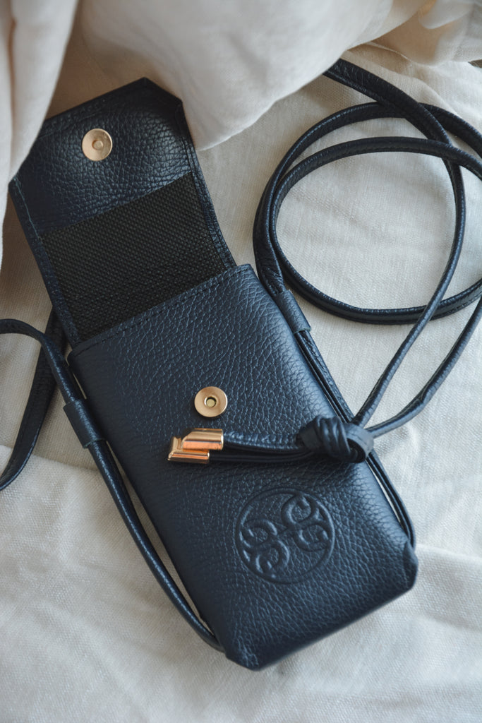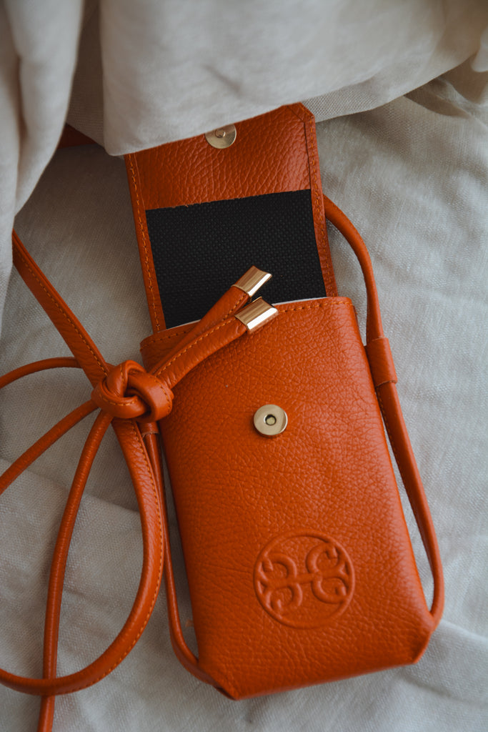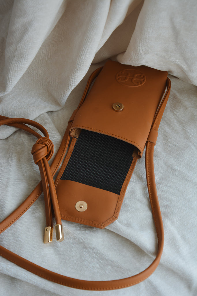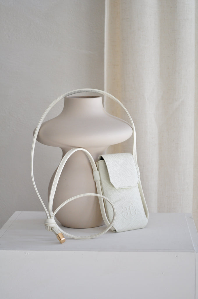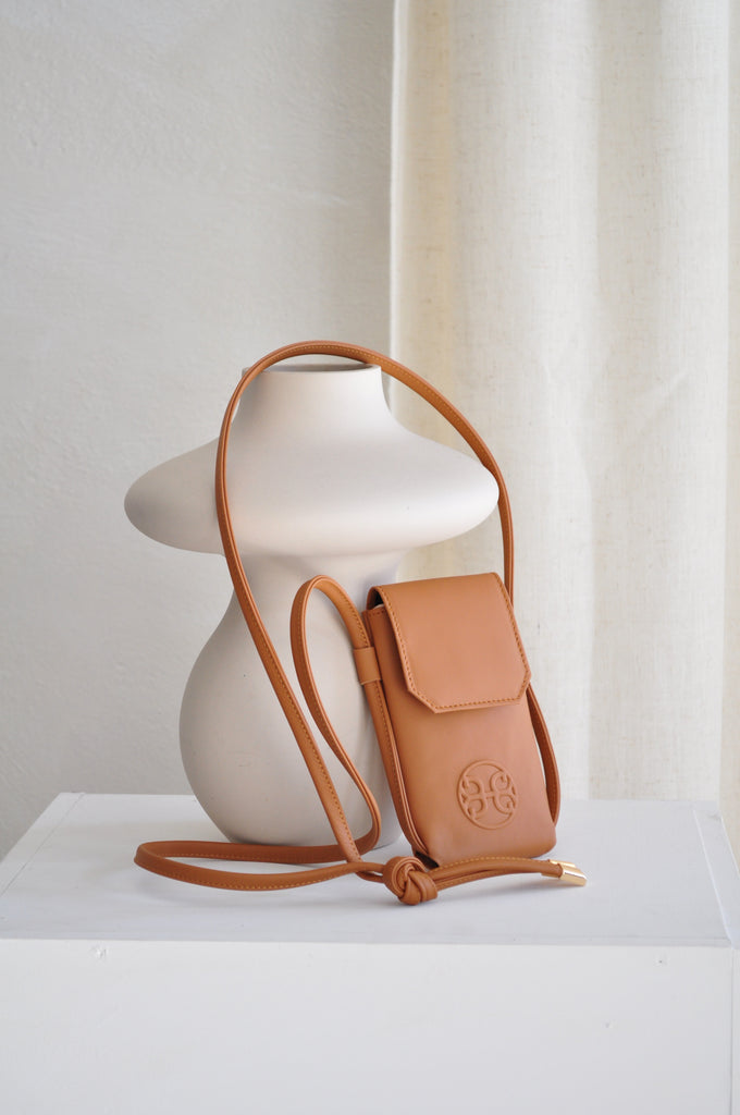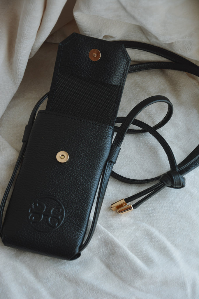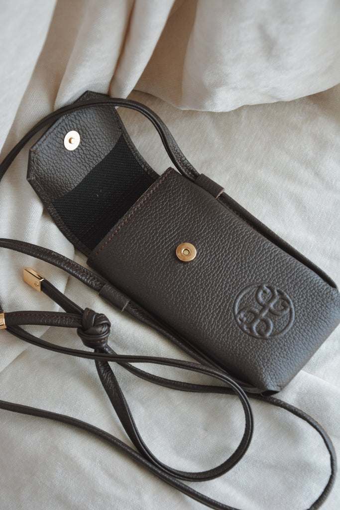 Un sac de téléphone en cuir élégant, raffiné avec une sangle nouée et des accents dorés. Une poche arrière discrète ajoute une fonction à sa forme élégante - une petite pièce à l'élégance intemporelle.
