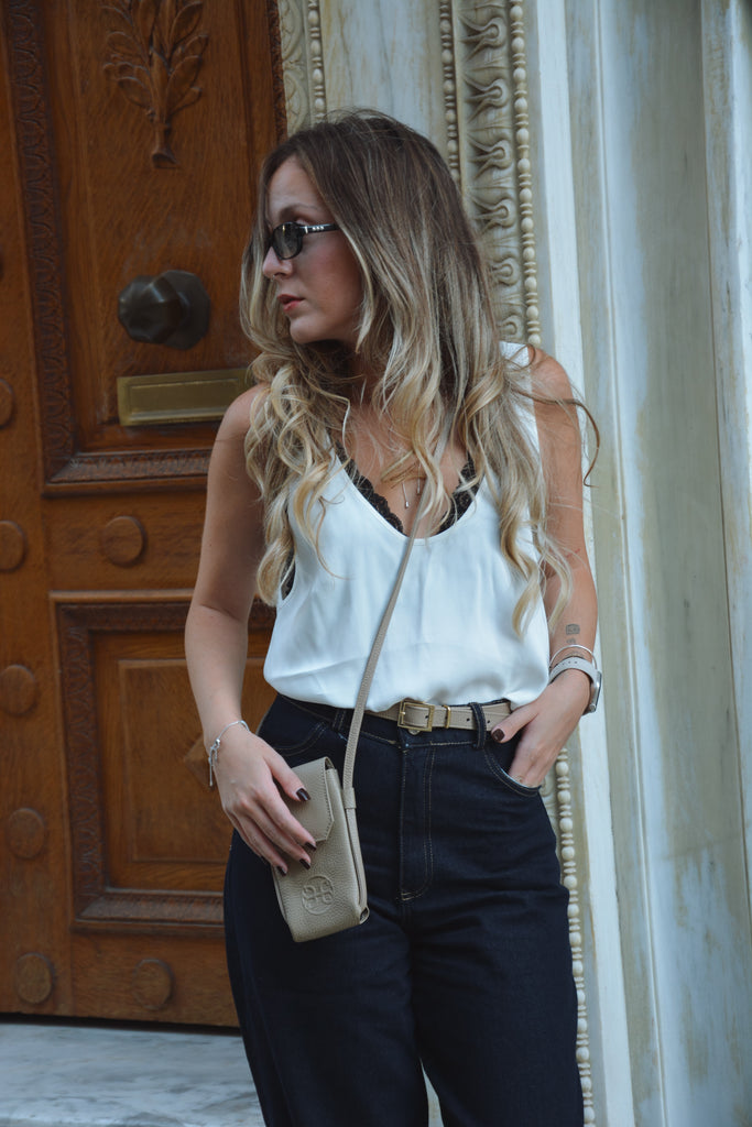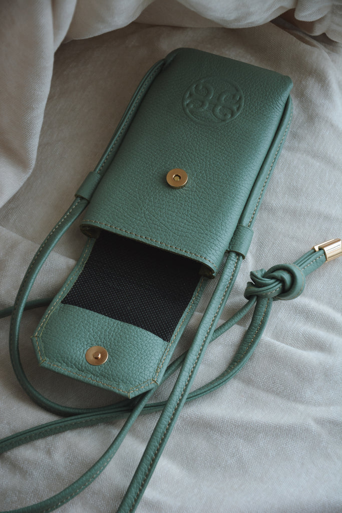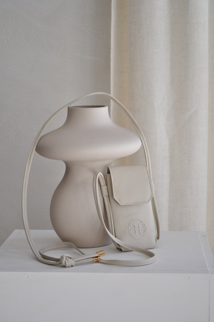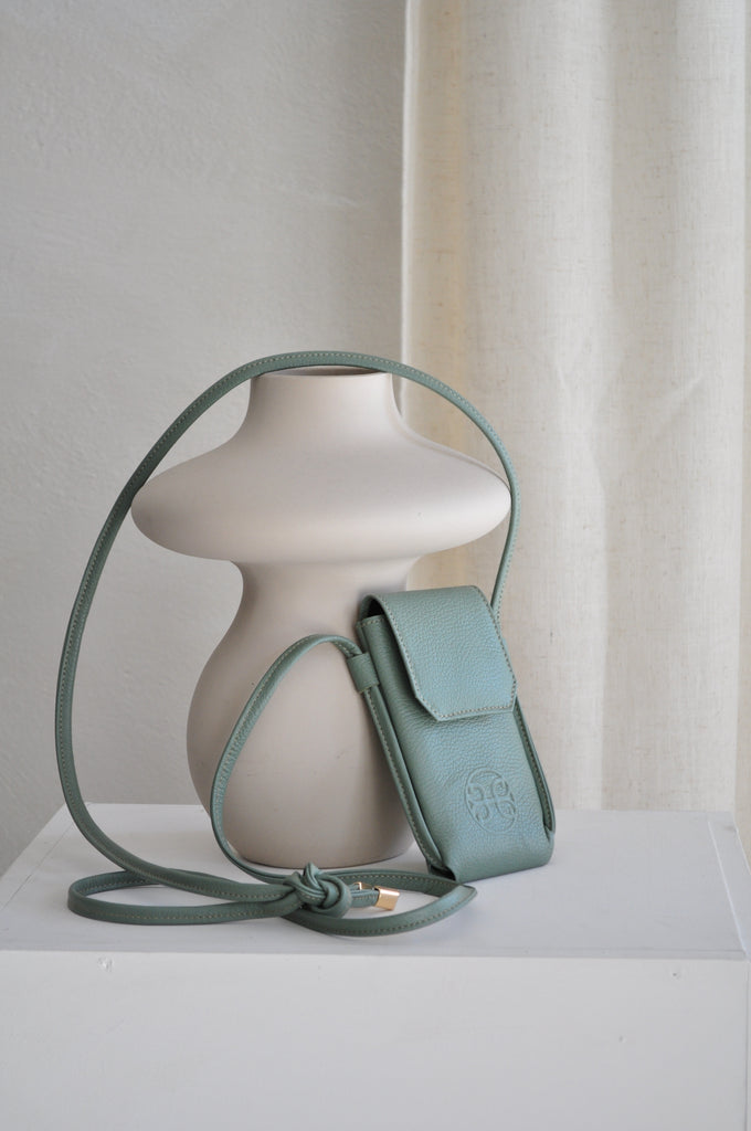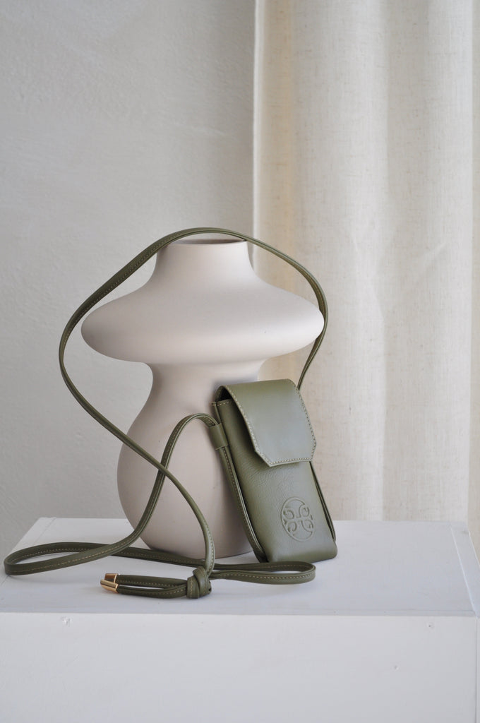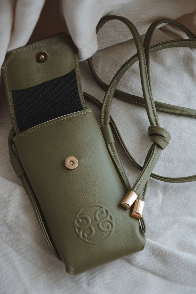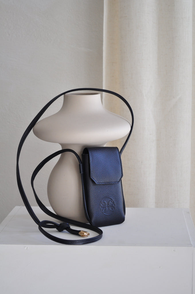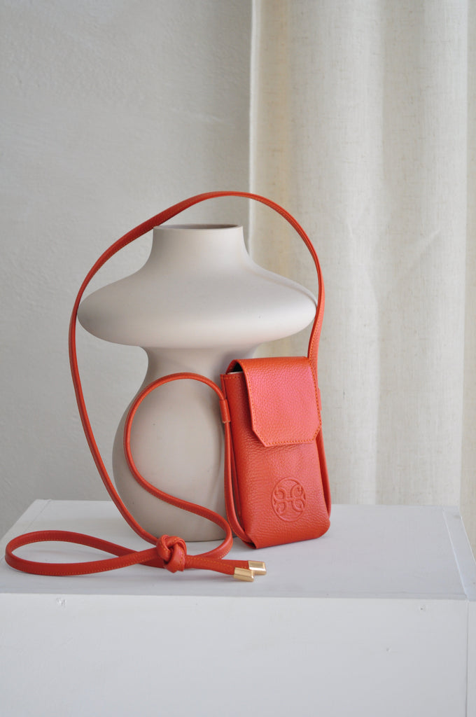 Un sac de téléphone en cuir élégant, raffiné avec une sangle nouée et des accents dorés. Une poche arrière discrète ajoute une fonction à sa forme élégante - une petite pièce à l'élégance intemporelle.