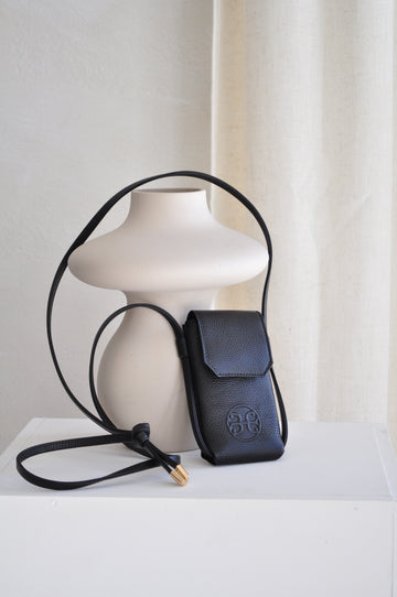 Un sac de téléphone en cuir élégant, raffiné avec une sangle nouée et des accents dorés. Une poche arrière discrète ajoute une fonction à sa forme élégante - une petite pièce à l'élégance intemporelle.
