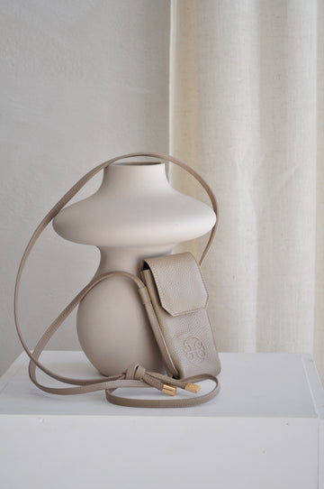 Un sac de téléphone en cuir élégant, raffiné avec une sangle nouée et des accents dorés. Une poche arrière discrète ajoute une fonction à sa forme élégante - une petite pièce à l'élégance intemporelle.