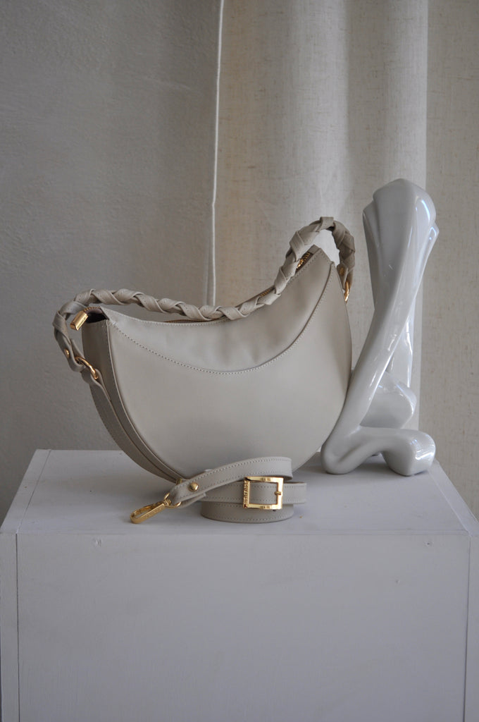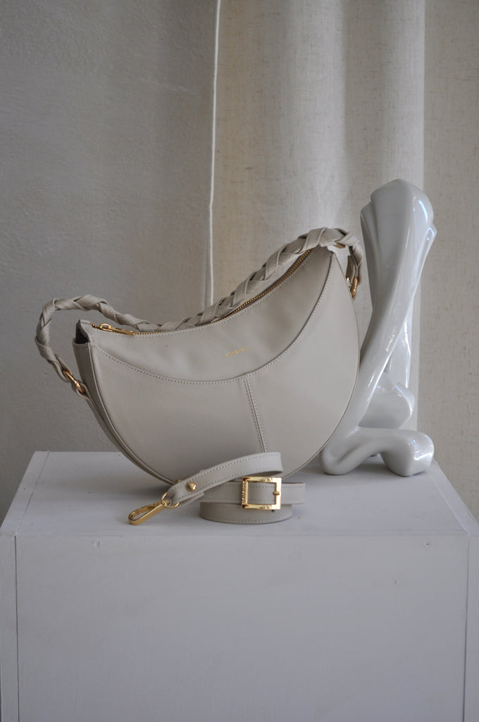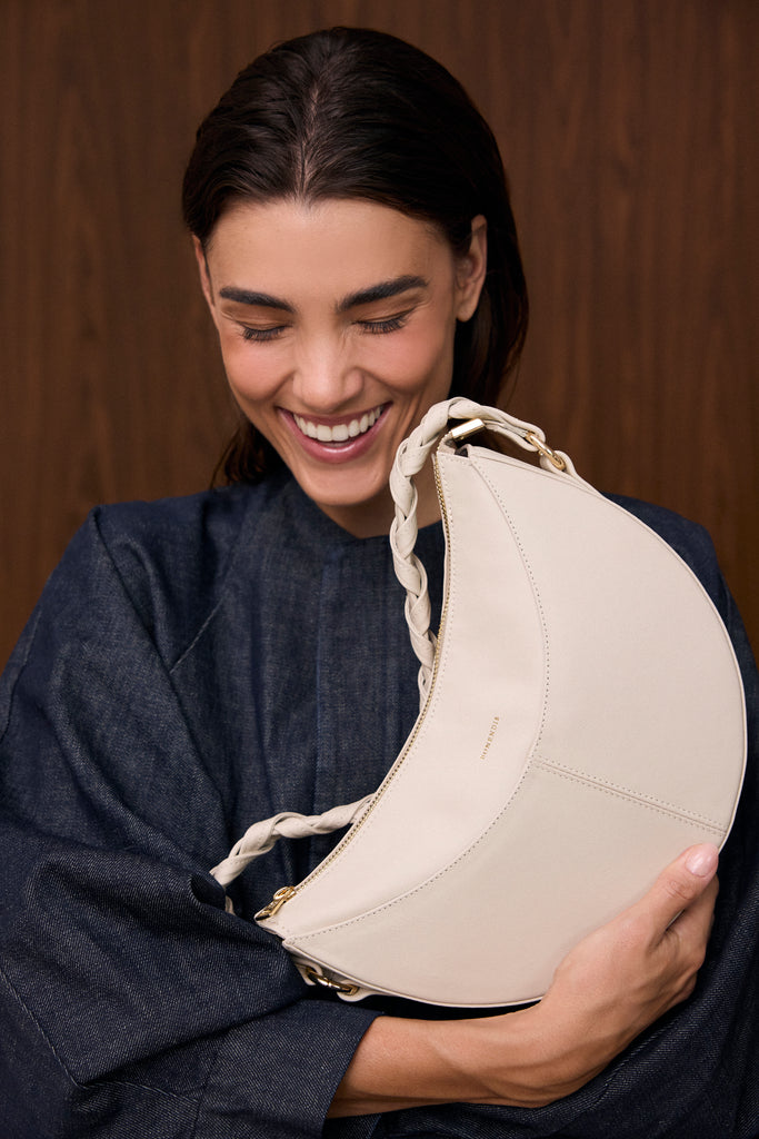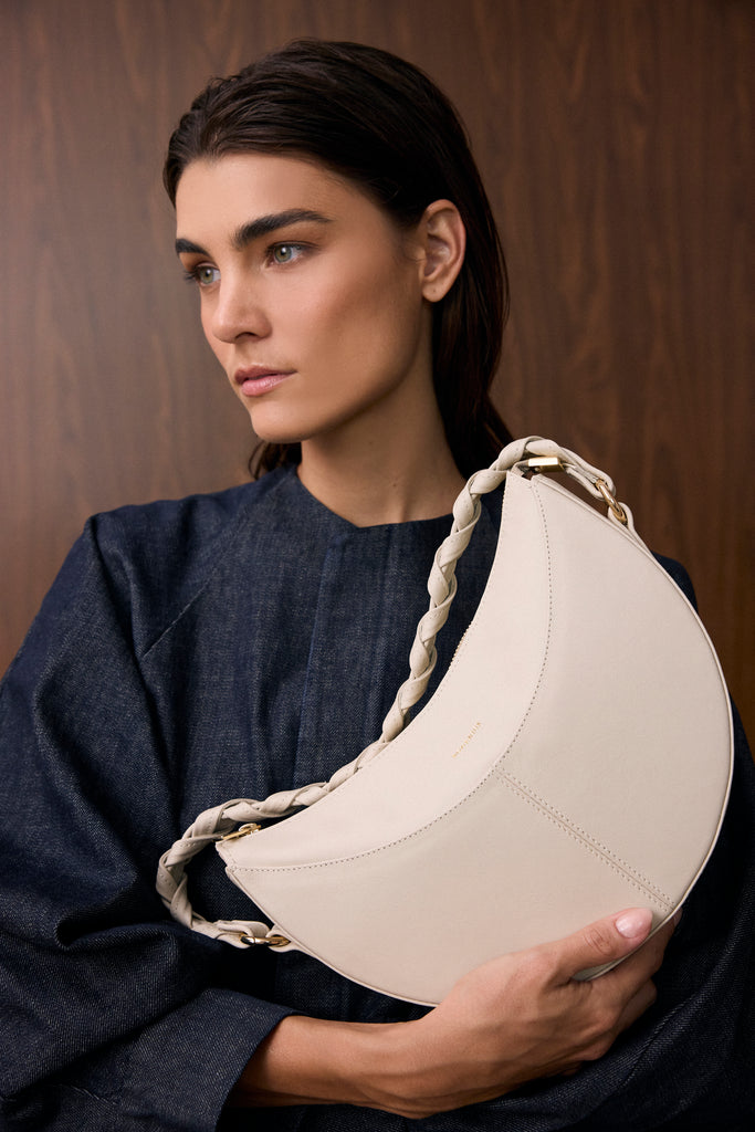 Sophie est le sac qui allie singularité et élégance. Avec sa forme distinctive en demi-lune, il peut être porté à la fois comme un sac croisé et comme un sac à bandoulière, tandis que sa poignée unique en cuir tressé rehausse n'importe quelle tenue avec style.