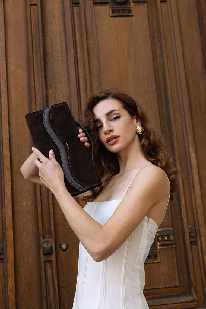 The Bonendis Baguette is an ode to understated luxury. Wrapped in deep chocolate suede and defined by its signature wavy detail that gently sweeps across the front, it exudes a sense of calm refinement. Clean geometry meets supple texture, creating a bag that balances modern minimalism with timeless allure.