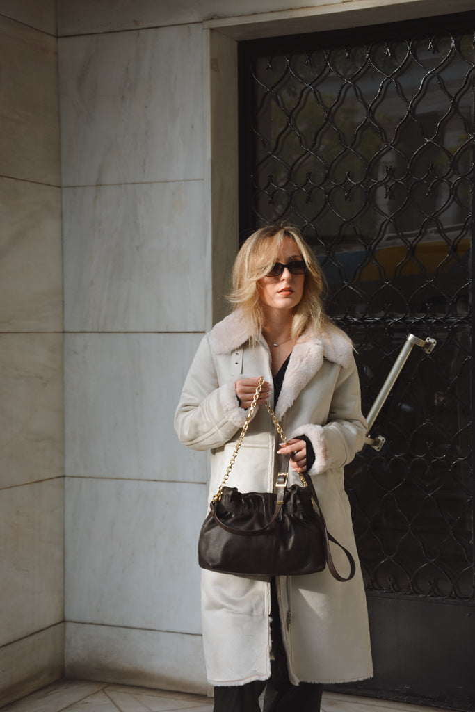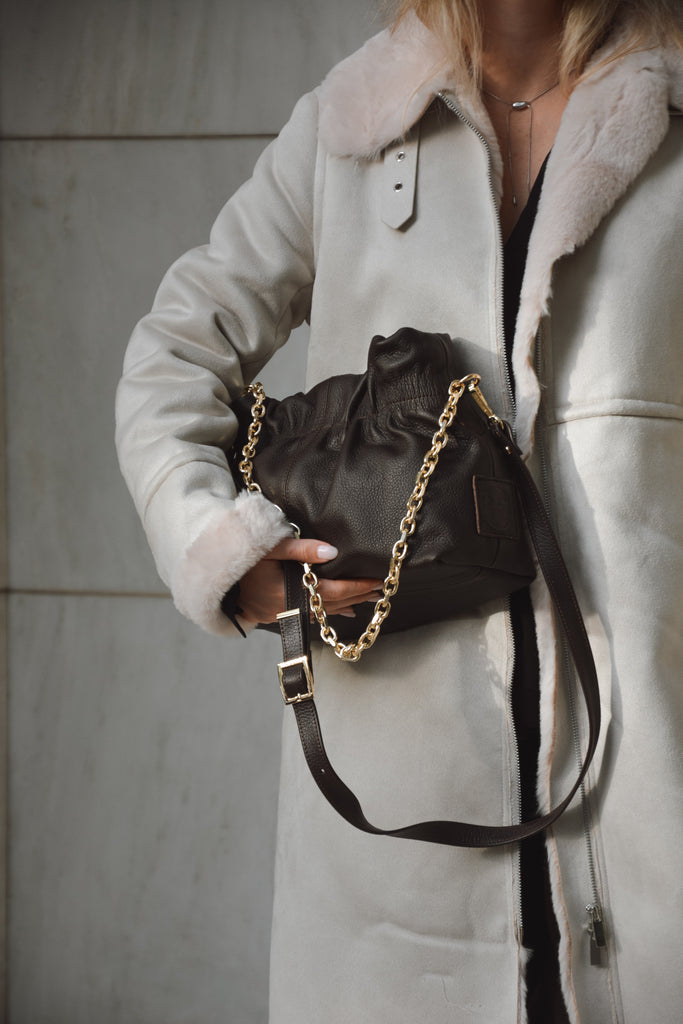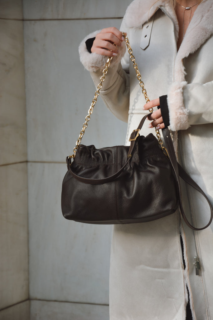 The Nefeli Leather Boho Pouch is the perfect blend of elegance and free-spirited charm. Crafted from premium leather, this shoulder bag features a sleek chain strap and a leather strap for a touch of effortless sophistication. Compact yet stylish, it's your go-to accessory for both casual and chic outings.