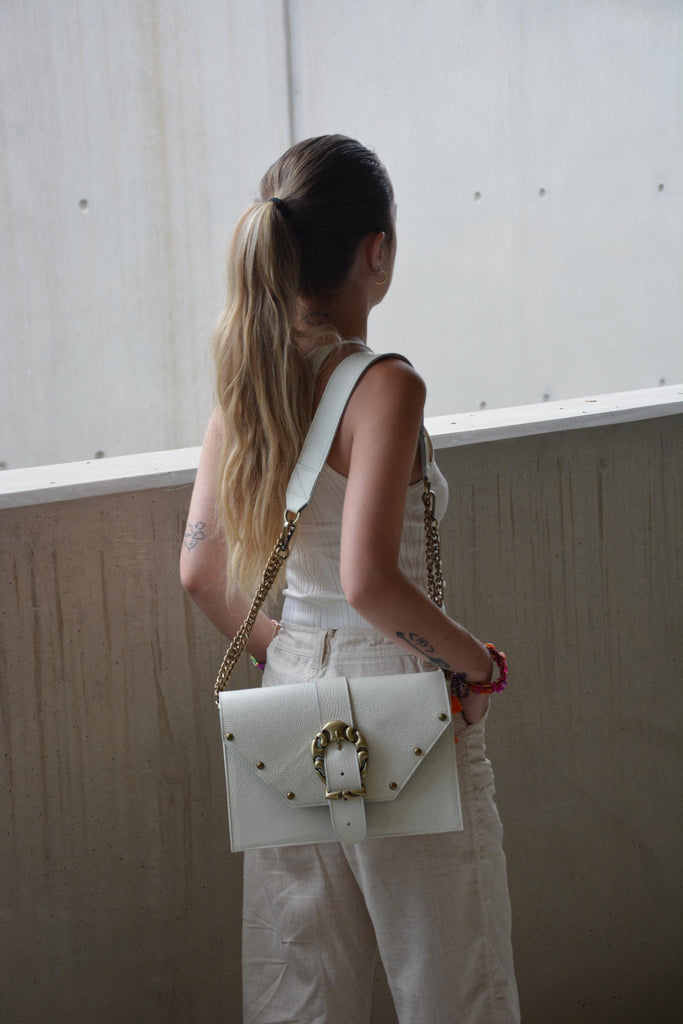 Le sac à bandoulière en cuir Briana est beau et audacieux. Briana est un sac à bandoulière pour le jour et la nuit. Vous pouvez ajuster la longueur de la chaîne et le transformer en sac à bandoulière. Donnez-lui une touche plus rock en doublant la chaîne. Portez-le en toute confiance et transportez tous vos articles nécessaires dans ce sac idéal.
