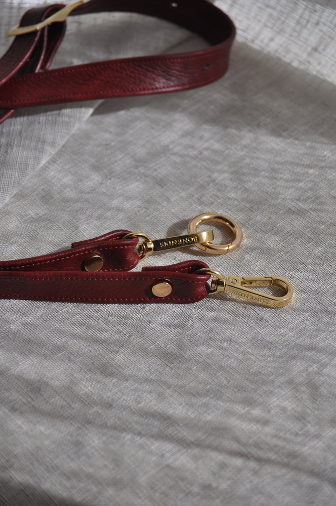 Le bracelet en cuir Bonendis est muni d'un cercle d'ouverture en or. Sa longueur totale de 120 cm permet de la porter en bandoulière.